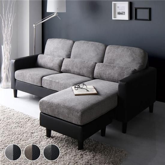 商品名:カウチ ソファー セット 〔3人掛け+オットマン グレー×ブラック〕 コンパクト カバーリング ローソファー