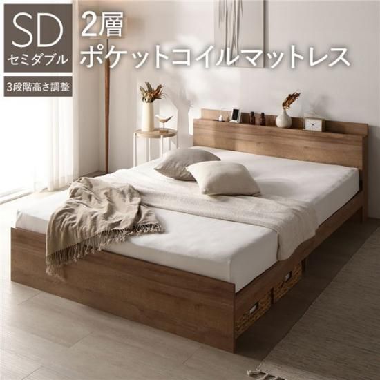 商品名:ベッド セミダブル 2層ポケットコイルマットレス付 シャビーオーク 高さ調整可 宮付 すのこ
