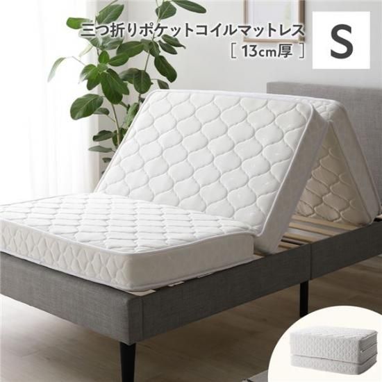 商品名:3つ折り ポケットコイル マットレス シングル 約W97×D195cm 13cm厚 両面仕様 ホワイト 薄型 折りたたみマットレス 寝具