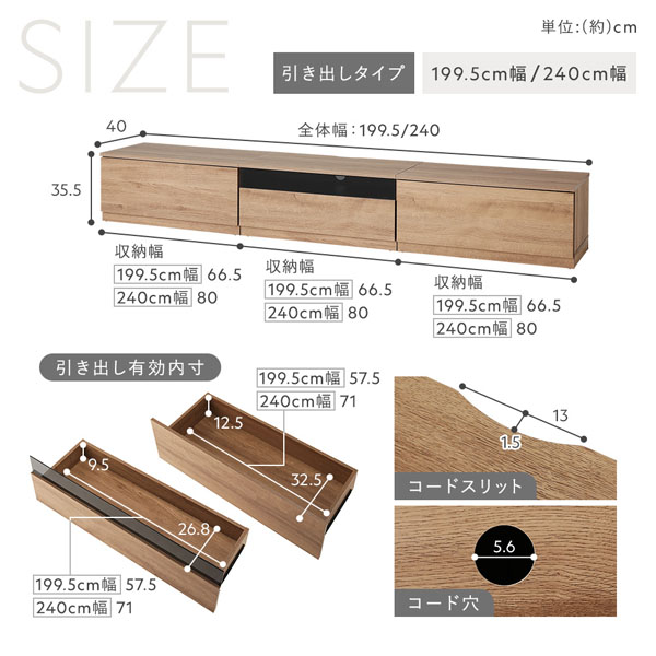 199.5cm幅:幅199.5×奥行40×高さ35.5cm