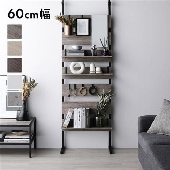 商品名:突っ張り ウォールラック 〔 60cm幅 グレージュ×ブラック 〕 ミラー付き 壁面収納 棚 賃貸OK 組立品