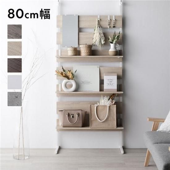 商品名:突っ張り ウォールラック 〔 80cm幅 ナチュラル×ホワイト 〕 ミラー付き 壁面収納 棚 賃貸OK 組立品