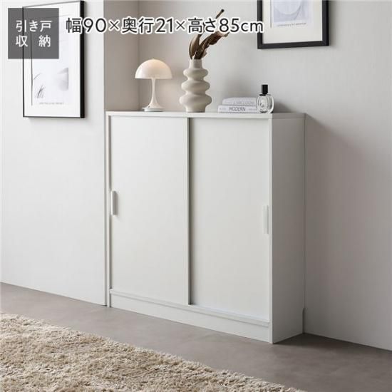 商品名:スリム 収納棚 キャビネット 約幅90×奥行21cm ホワイト 木目なし 引き戸 可動棚 背面なし リビング収納 キッチン収納 収納家具